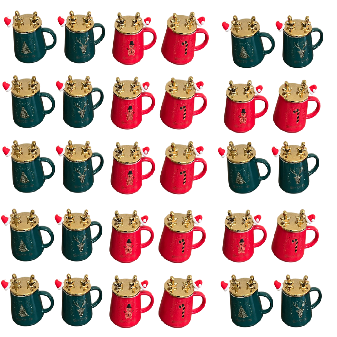 Treinta Hermosas tazas con tapa dorada y motivos navideños. Ideales para esta temporada como regalo o detalles muy navideños.