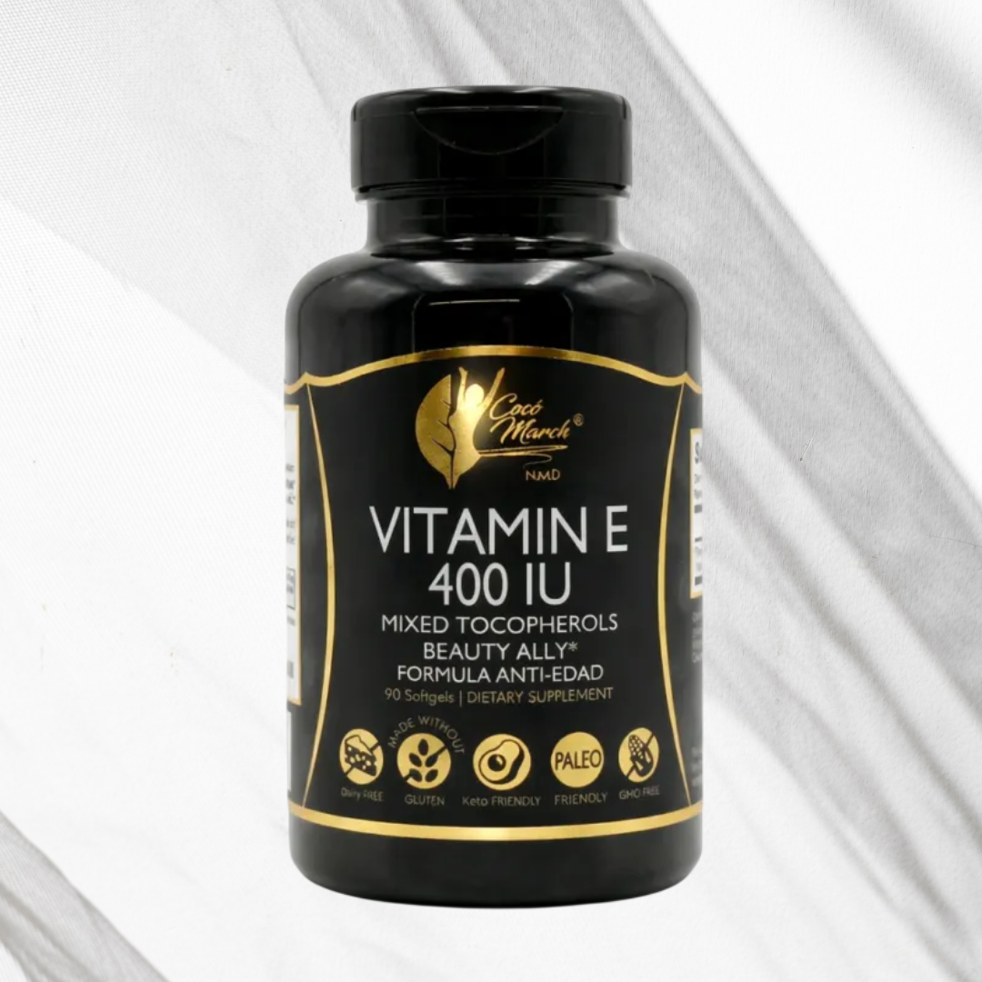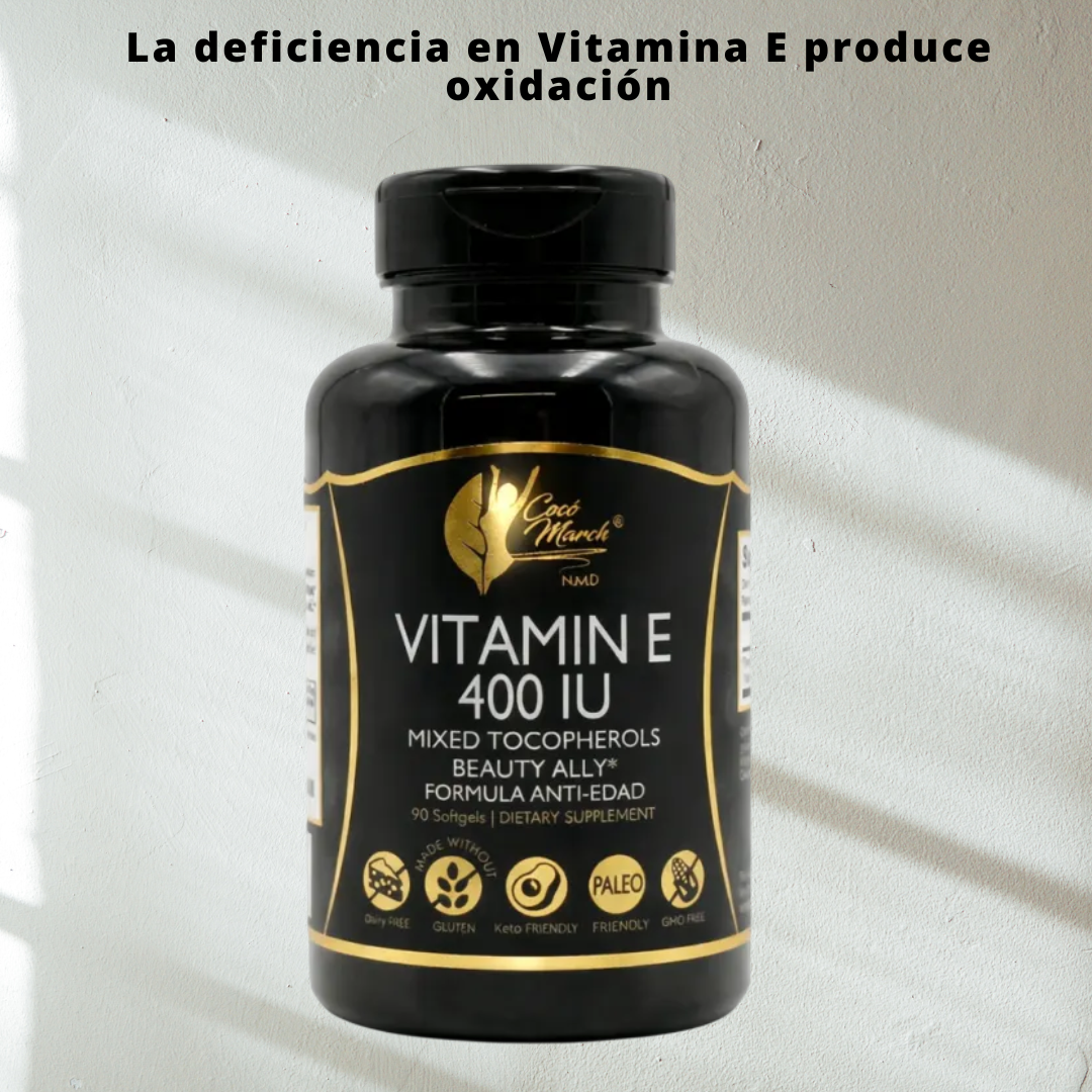 La Vitamina E es un antioxidante esencial para tener una piel y un pelo radiantes. La deficiencia en Vitamina E produce oxidación y contribuye al envejecimiento prematuro.